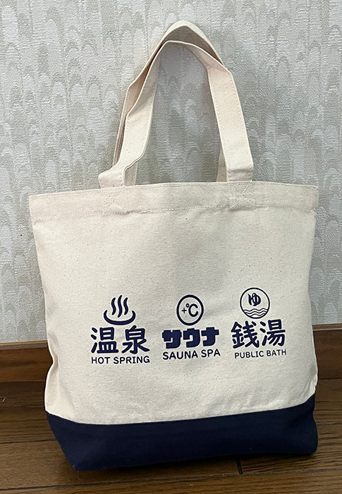 銭湯に行ったり、ちょこっとお買い物に行ったりする際に便利なミニサイズのトートバッグ。カラーはホワイト×ネイビー。薄手のコットンなので折り畳めます。サイズは高さ25×横幅32×マチ10㎝(持ち手を除く)
